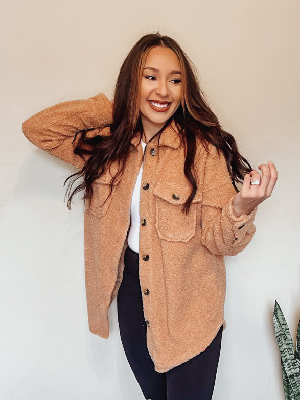 Longline fleece button down collars jacket with front pockets and cuff buttons. Rounded dolphin hem.